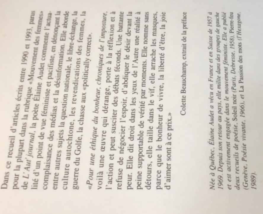 "La plupart des textes de ces chroniques de l'imposture ont été publiés, entre 1990 et 1993, dans la rubrique "Mouvement des femmes" de L'Aut'journal... S'y trouvent aussi des écrits parus dans des ouvrages collectifs, dans Le Devoir ainsi qu'un inédit..." - P.